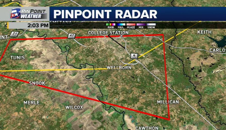 Severe weather updates in the Brazos Valley | khou.com 23 hours ago · The TORNADO WARNING that has been issued for Brazos, Grimes and Burleson Counties is from a radar-indicated tornado. At this time, there is no indication there is a confirmed tornado on the ground....